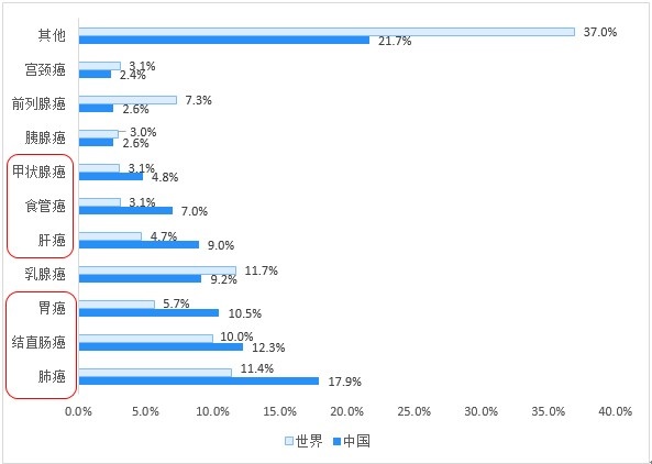 2020年我國與世界前十惡性腫瘤發病率對比(單位:%)