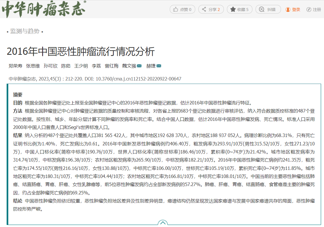 2023年3月22日,國家(jiā)癌症中心在《中華腫瘤雜志(zhì)》發布了最新一期的全國癌症統計(jì)數(shù)據,公布2016年中國惡性腫瘤流行(xíng)數(shù)據,首次提供各省主要癌譜流行(xíng)情況。全國腫瘤登記中心負責全國腫瘤登記數(shù)據收集、質量控制(zhì)、彙總、分析及發布工作(zuò)。(由于全國腫瘤登記中心的數(shù)據一般滞後,本次報告發布數(shù)據為(wèi)全國腫瘤登記中心收集彙總全國腫瘤登記處2016年登記資料,一般會(huì)滞後3年)