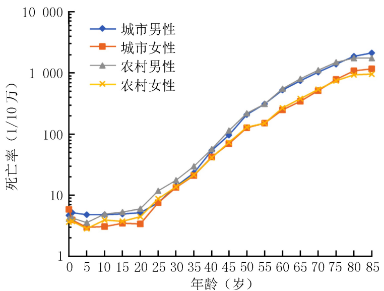死亡率随年齡增加而逐漸上(shàng)升,在城市和(hé)農村,男性死亡率均較女性更高(gāo),但(dàn)在低(dī)年齡段中,男女年齡死亡率接近。死亡率在35歲之前呈現交替上(shàng)升趨勢,35歲之後男性各年齡組死亡率均高(gāo)于女性,且差異随年齡的增加而增大(dà)。
