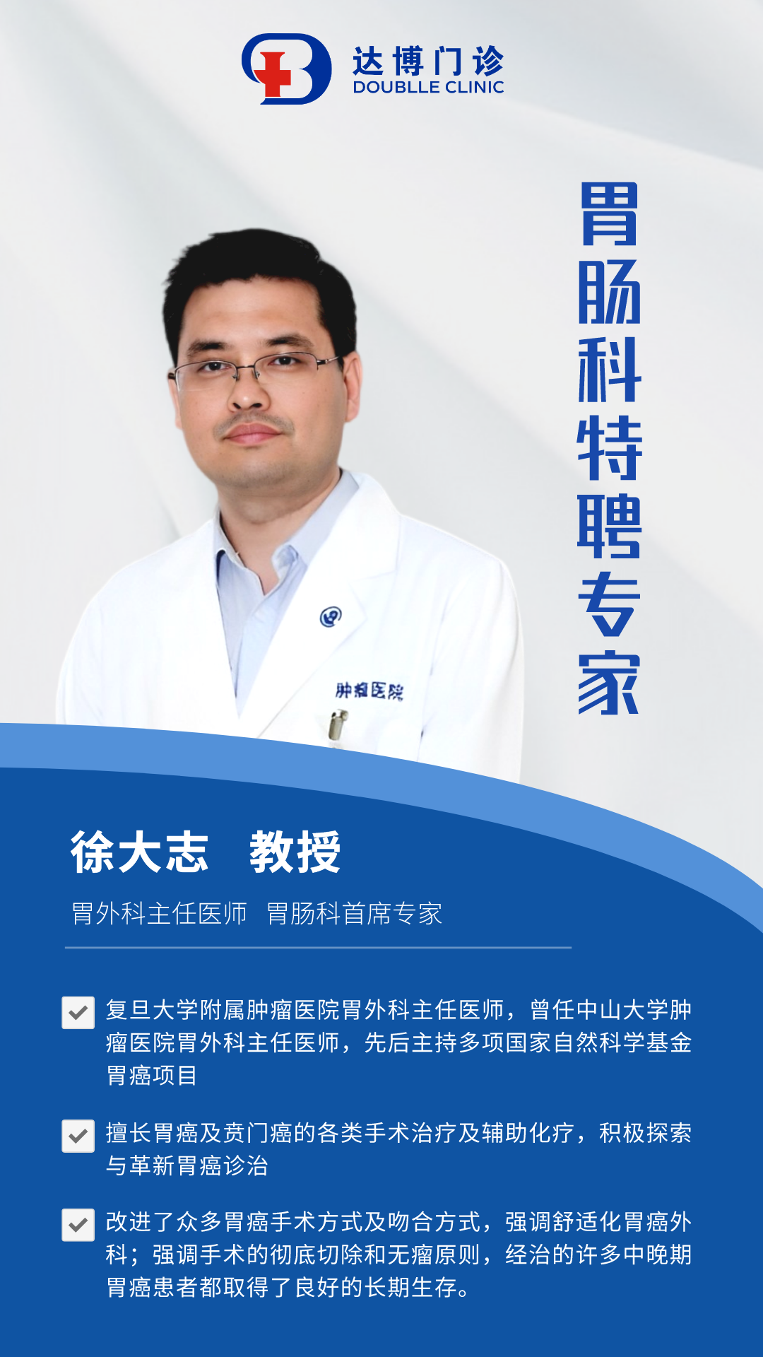 徐大(dà)志(zhì),教授、主任醫(yī)師(shī),複旦大(dà)學腫瘤醫(yī)院胃外科常務副主任。臨床方面,在胃癌診治上(shàng)做(zuò)了許多(duō)積極的探索與革新,如免胃管免腸道(dào)準備的胃癌根治手術(shù),胃癌術(shù)中腹腔灌洗,胃癌的擴大(dà)淋巴結清掃及完全腹腔鏡的胃癌手術(shù)等。科研方面,以通(tōng)訊作(zuò)者發表了多(duō)篇高(gāo)質量的文章,先後主持多(duō)項國家(jiā)自然科學基金胃癌項目。
