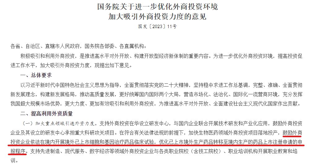 《意見》明(míng)确指出,“支持外商投資在華設立研發中心,與國內(nèi)企業聯合開(kāi)展技(jì)術(shù)研發和(hé)産業化應用,鼓勵外商投資企業及其設立的研發中心承擔重大(dà)科研攻關項目。在符合有(yǒu)關法律法規的前提下,加快生(shēng)物醫(yī)藥領域外商投資項目落地投産,鼓勵外商投資企業依法在境內(nèi)開(kāi)展境外已上(shàng)市細胞和(hé)基因治療藥品臨床試驗,優化已上(shàng)市境外生(shēng)産藥品轉移至境內(nèi)生(shēng)産的藥品上(shàng)市注冊申請(qǐng)的申報程序。”