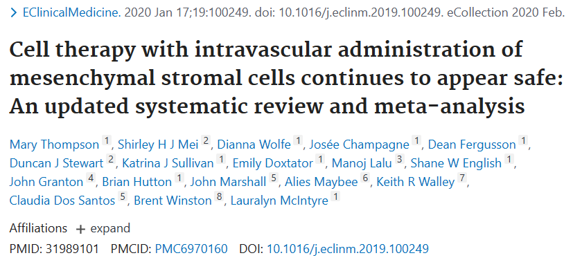 柳葉刀旗下雜志(zhì)《Eclinical Medicine》的一篇文章,總結了2012年至2019年的間(jiān)充質幹細胞臨床随機試驗,結果證實了間(jiān)充質幹細胞的安全性。